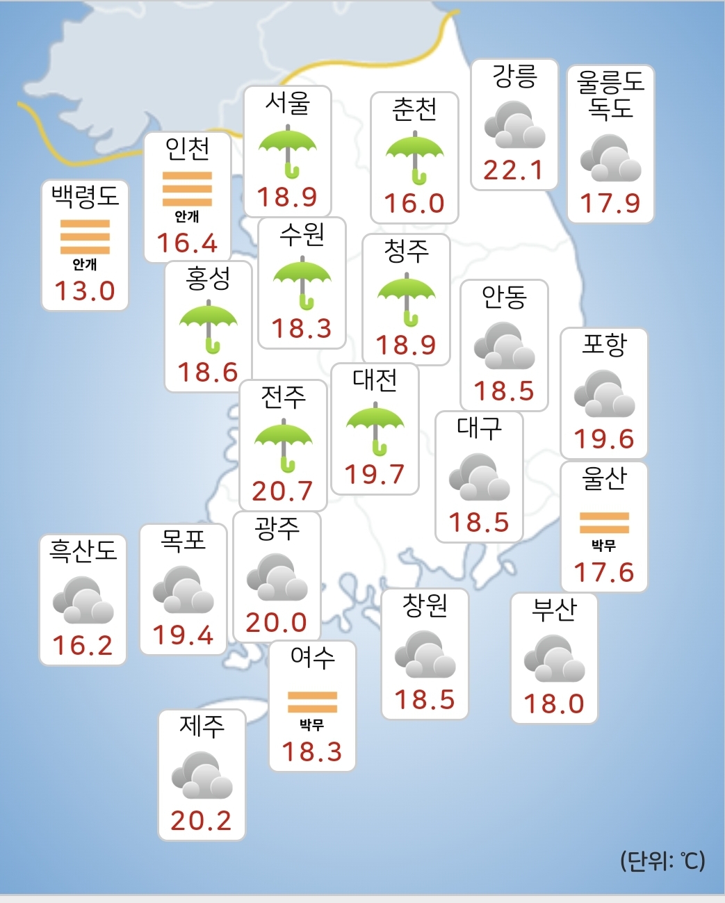 - 내일(16일) 아침최저기온은 14~19도, 낮최고기온은 19~26도가 되겠습니다.