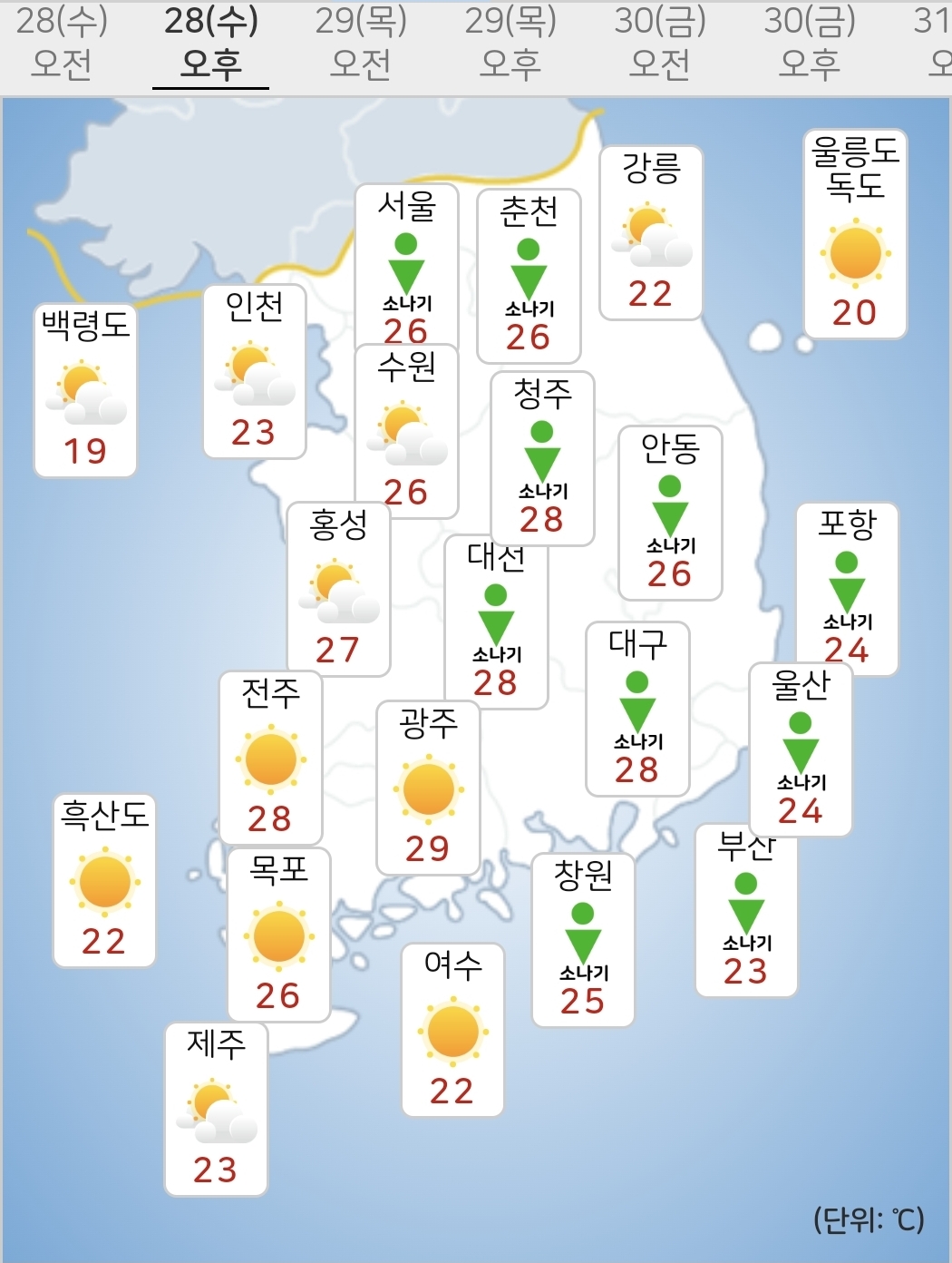 - 오늘(28일) 낮최고기온은 20~29도가 되겠습니다.