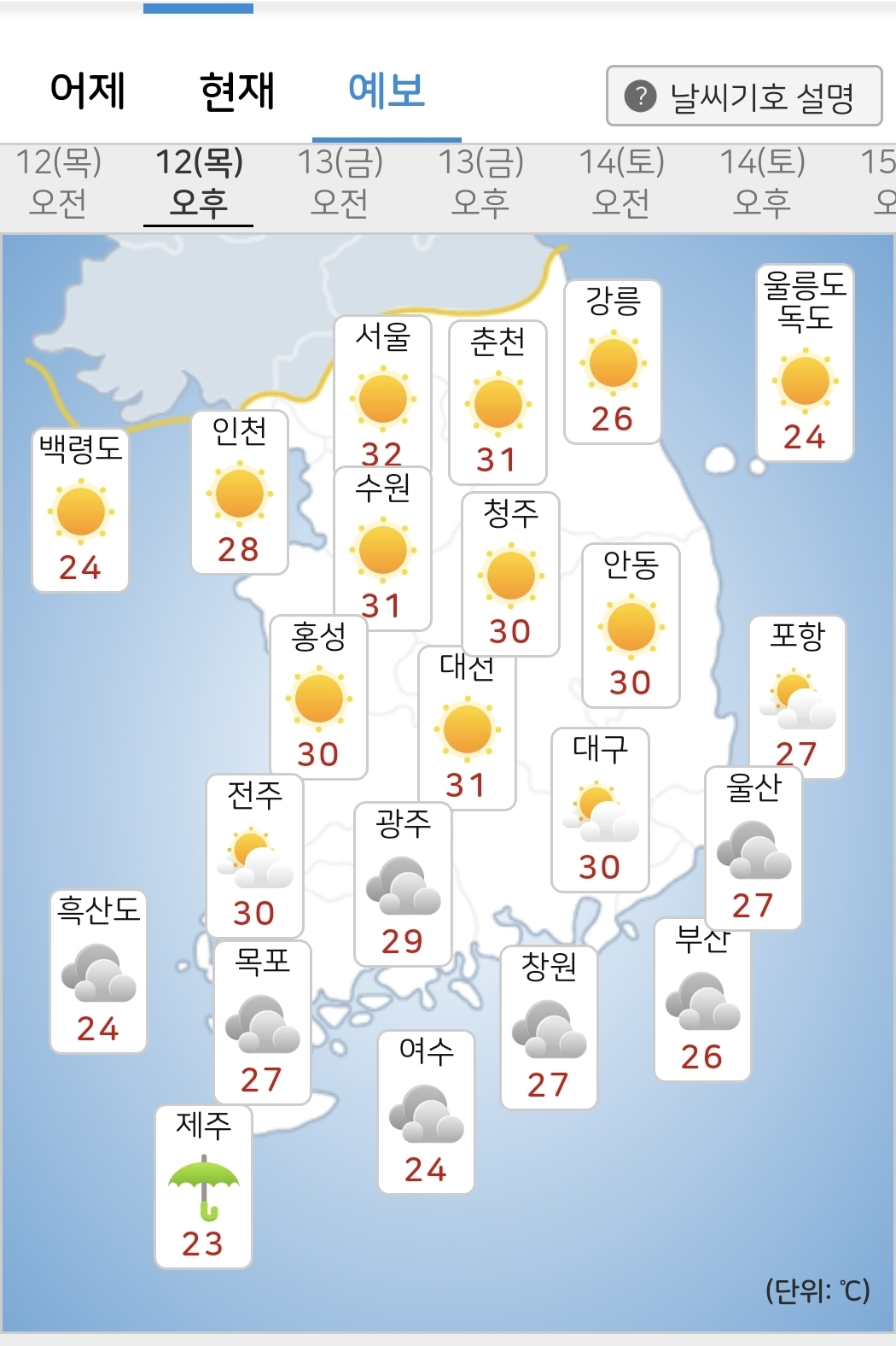 - 오늘(12일) 낮최고기온은 23~32도가 되겠습니다.