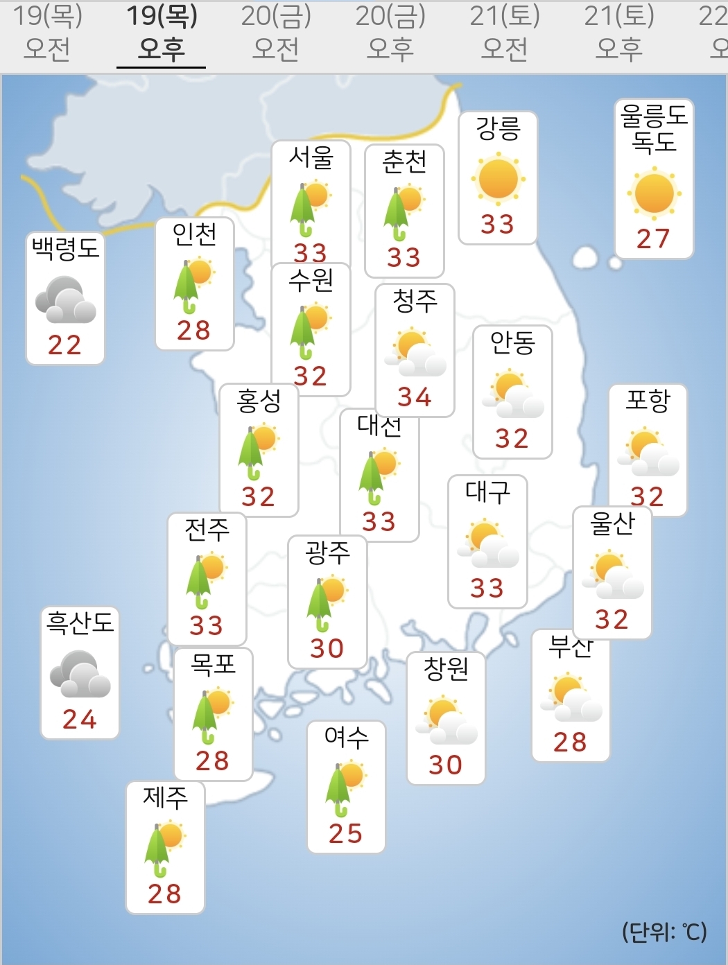 - 오늘(19일) 낮최고기온은 25~34도가 되겠습니다.