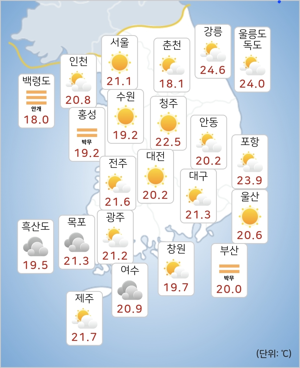 - 내일(20일) 아침최저기온은 20~24도, 낮최고기온은 24~30도가 되겠습니다.