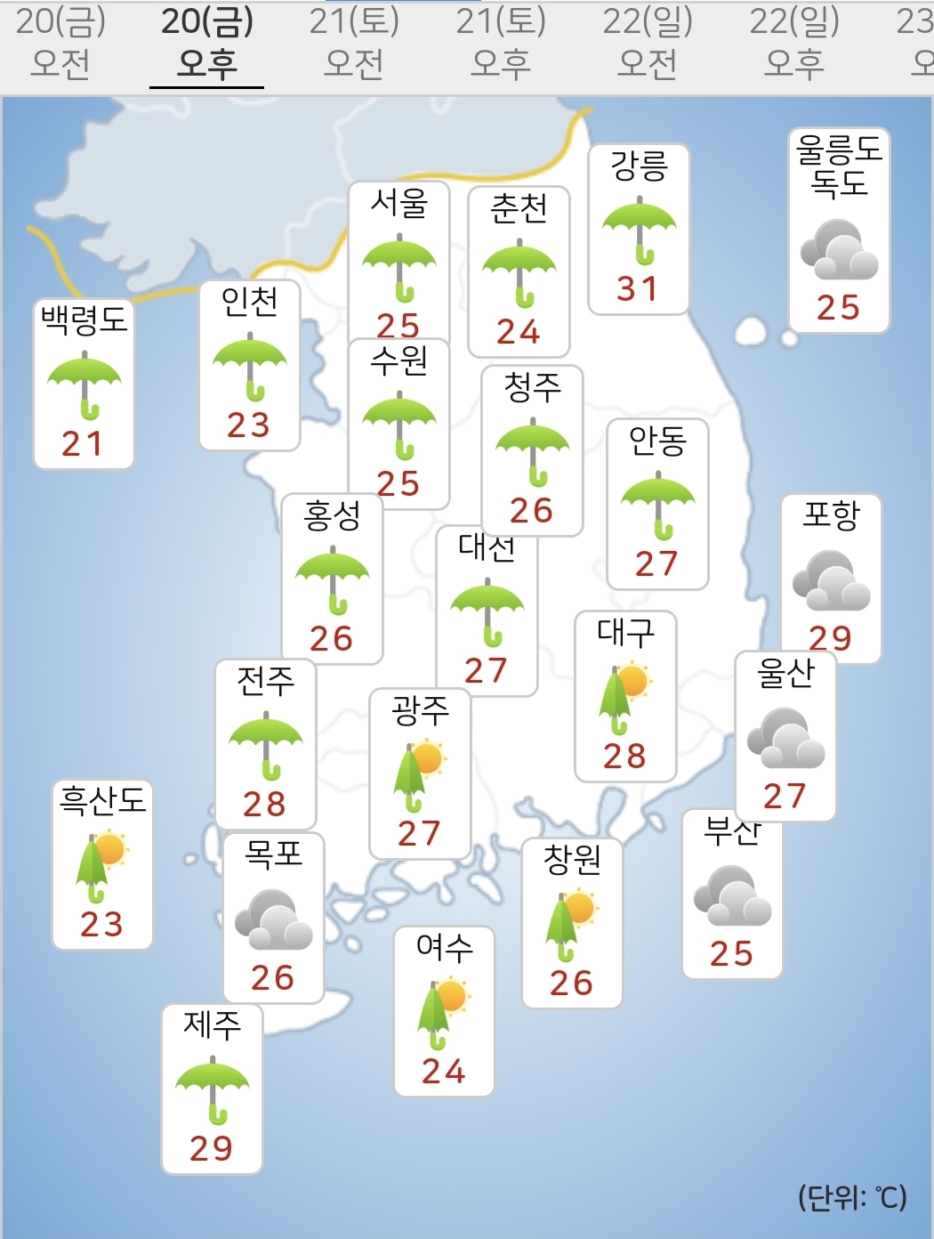 - 오늘(20일) 낮최고기온은 23~31도가 되겠습니다.