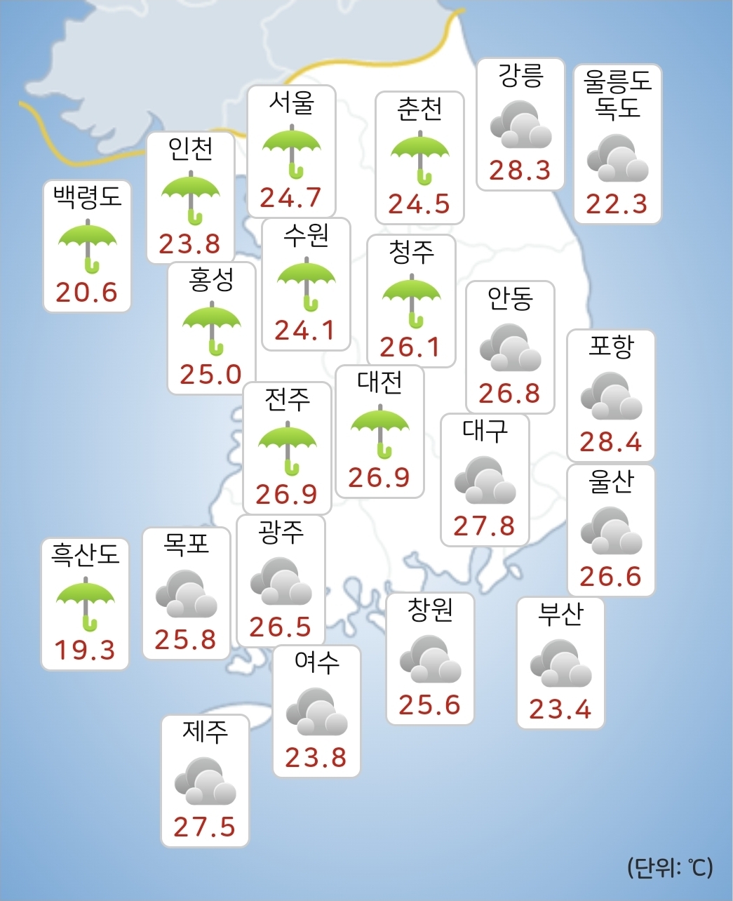 - 내일(21일) 아침최저기온은 20~24도, 낮최고기온은 24~29도가 되겠습니다.