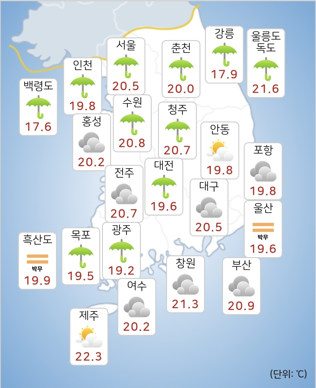 단기 전망) 오늘 전국 대부분 비, 내일과 모레 낮 기온 올라 덥겠음"