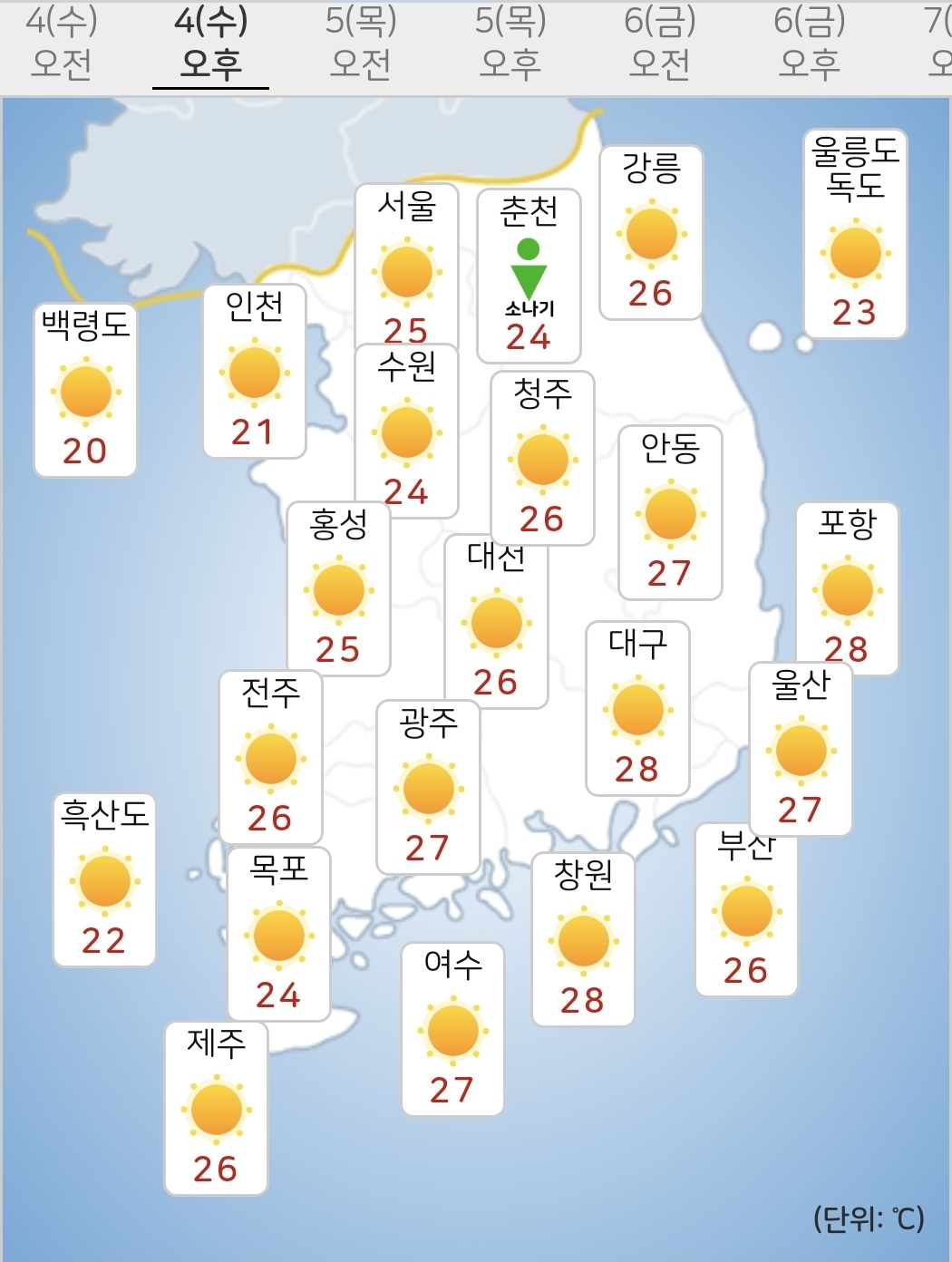 - 오늘(4일) 낮최고기온은 21~29도가 되겠습니다.
