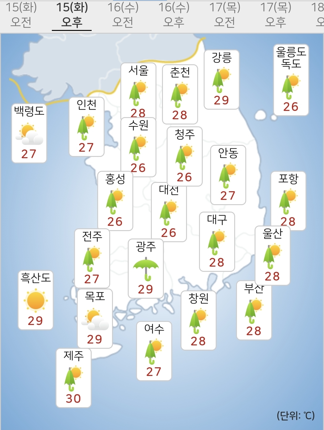 - 오늘(15일) 낮최고기온은 25~31도가 되겠습니다.