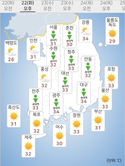 - 오늘(22일) 낮최고기온은 29~34도가 되겠습니다.