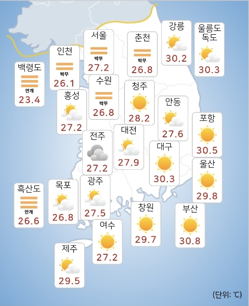 - 모레(9일) 아침최저기온은 21~27도, 낮최고기온은 26~36도가 되겠습니다.