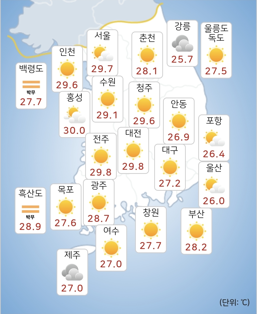 - 내일(10일) 아침최저기온은 20~25도, 낮최고기온은 26~35도가 되겠습니다.