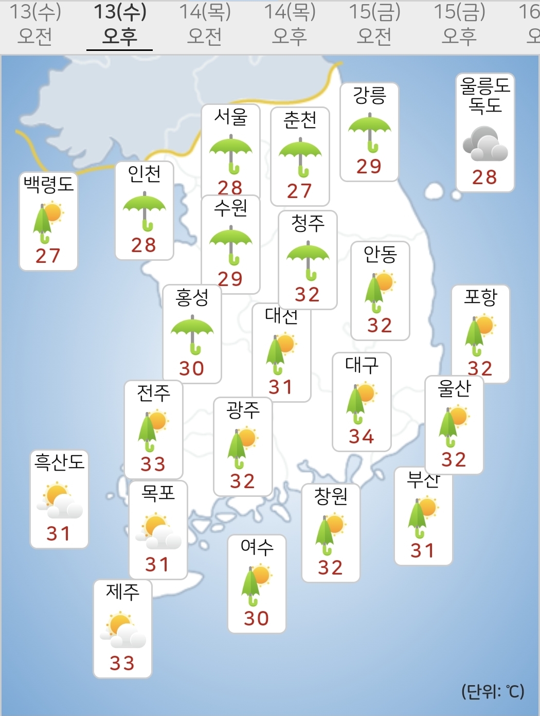 - 오늘(13일) 낮최고기온은 26~34℃가 되겠습니다.