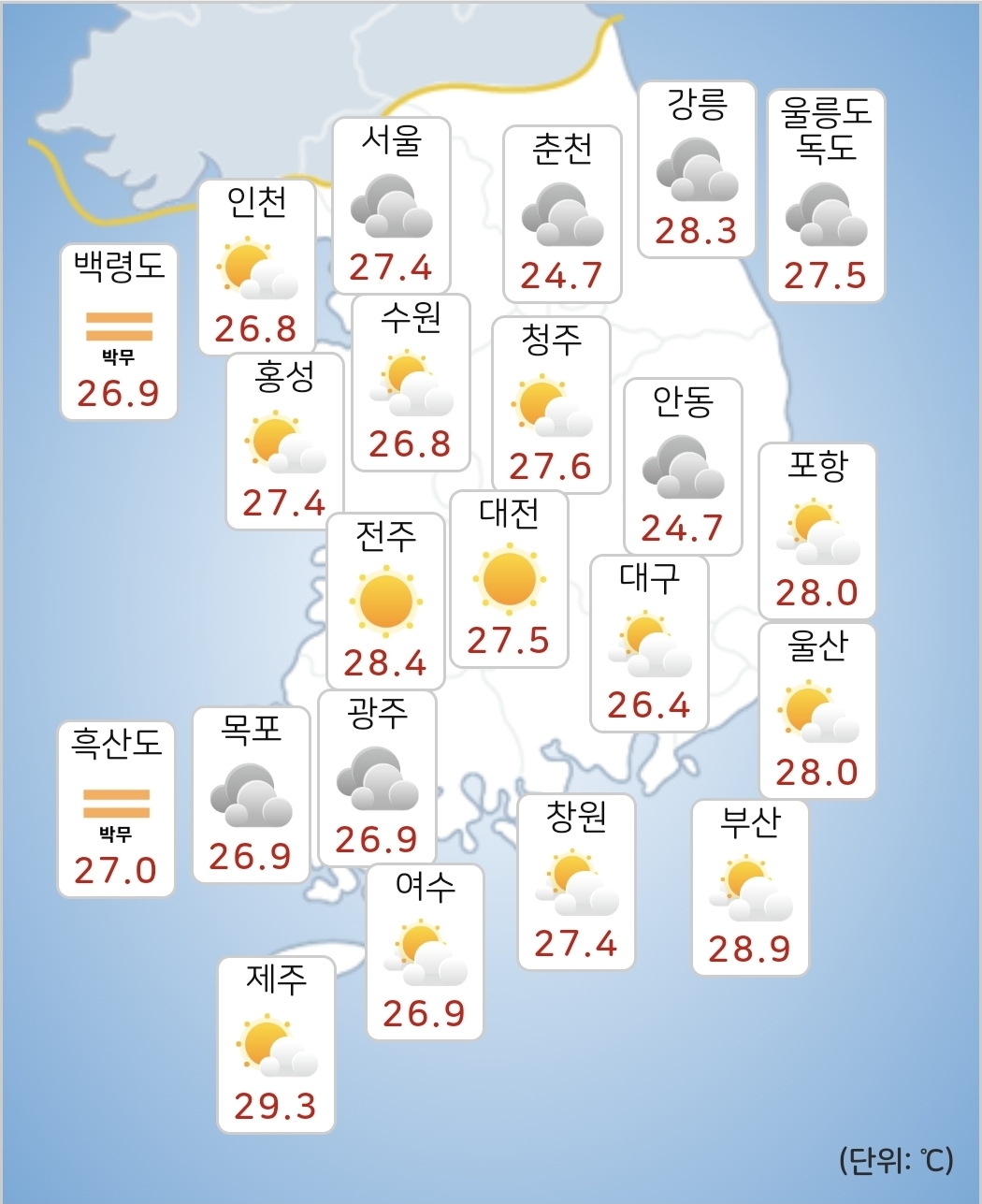 - 내일(19일) 아침최저기온은 22~27℃, 낮최고기온은 29~34℃가 되겠습니다.