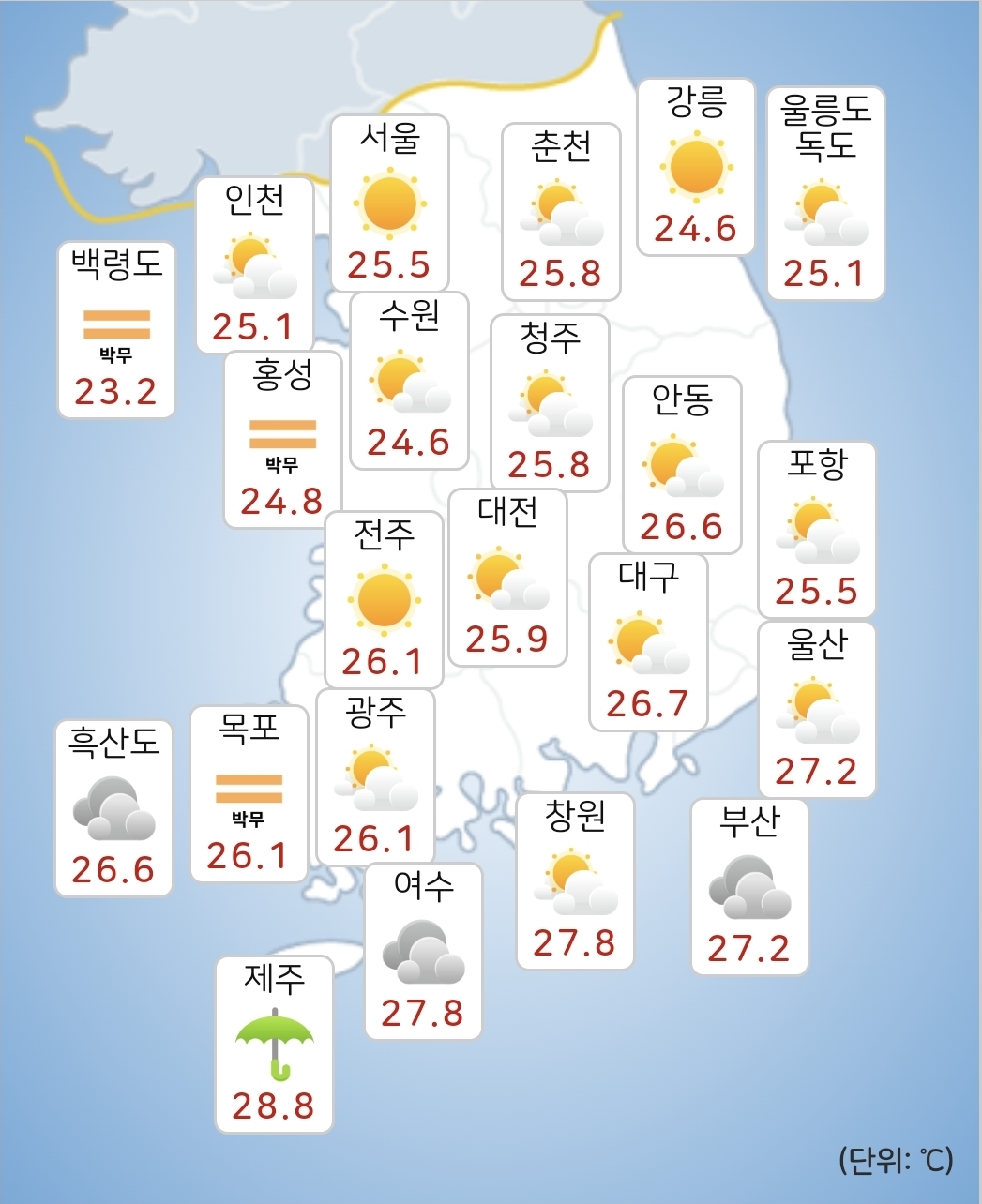 - 내일(6일) 아침최저기온은 23~27℃, 낮최고기온은 27~34℃가 되겠습니다.