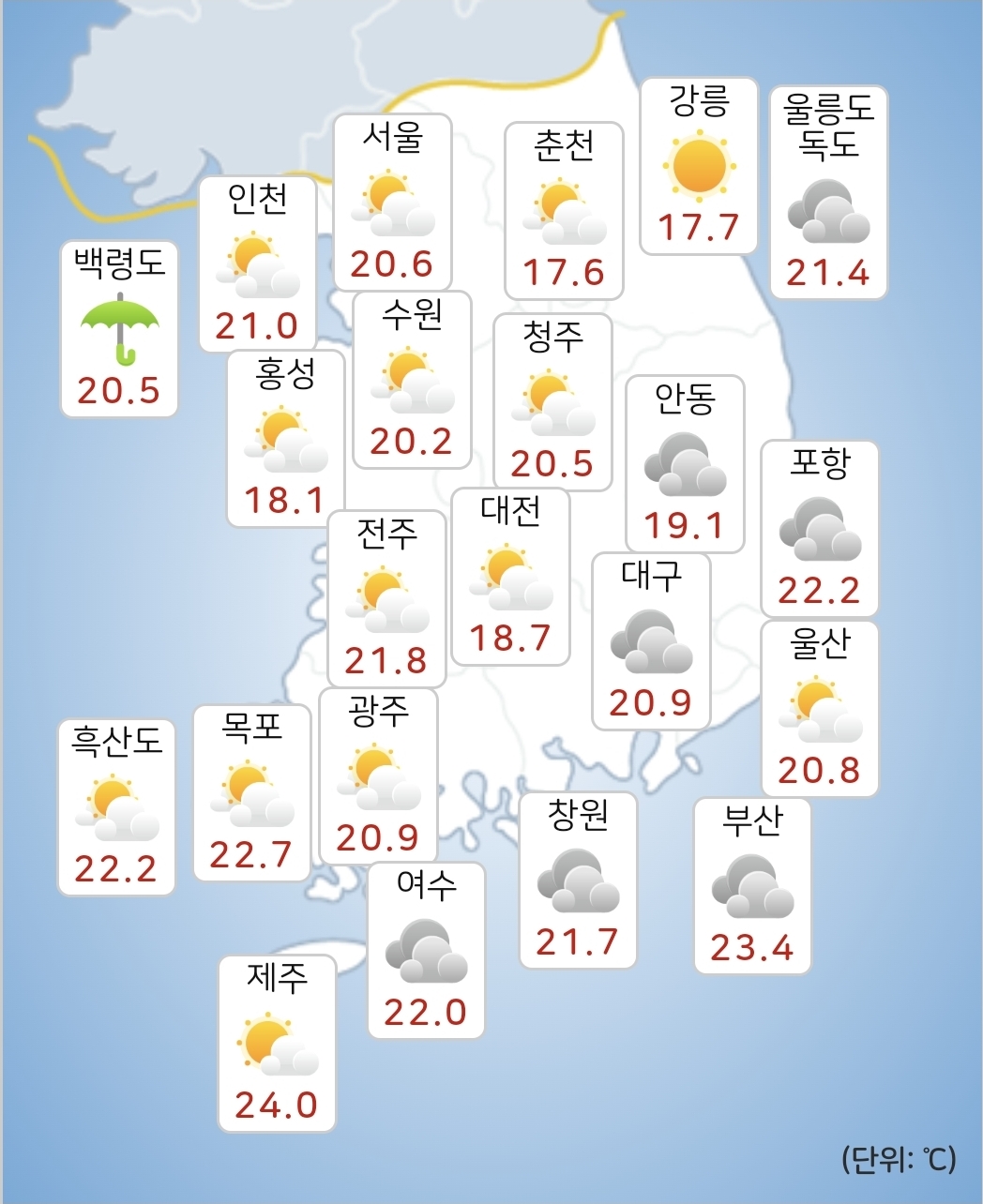 - 내일(25일) 아침최저기온은 17~24℃, 낮최고기온은 25~29℃가 되겠습니다.