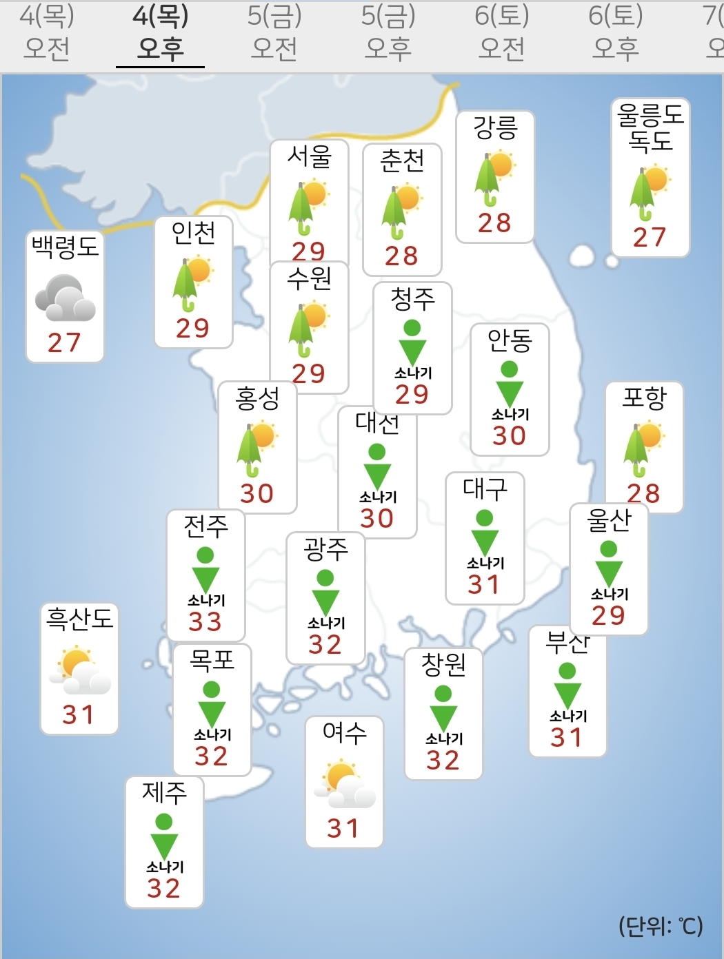 - 오늘(4일) 낮최고기온은 25~33℃가 되겠습니다.