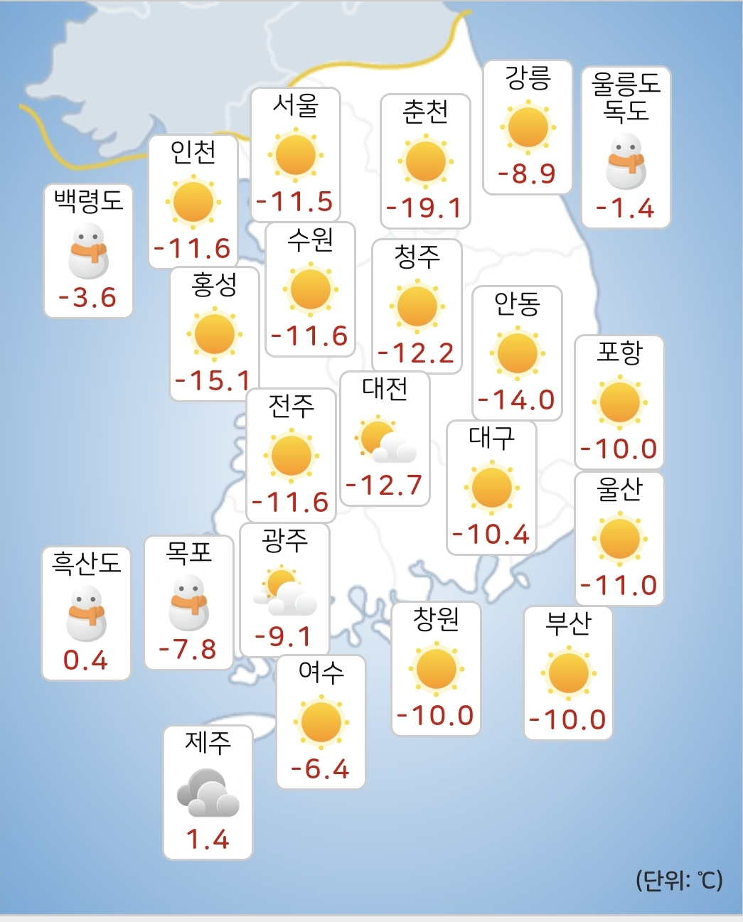 - 내일(11일) 아침최저기온은 -18~-2도, 낮최고기온은 -3~5도가 되겠습니다.