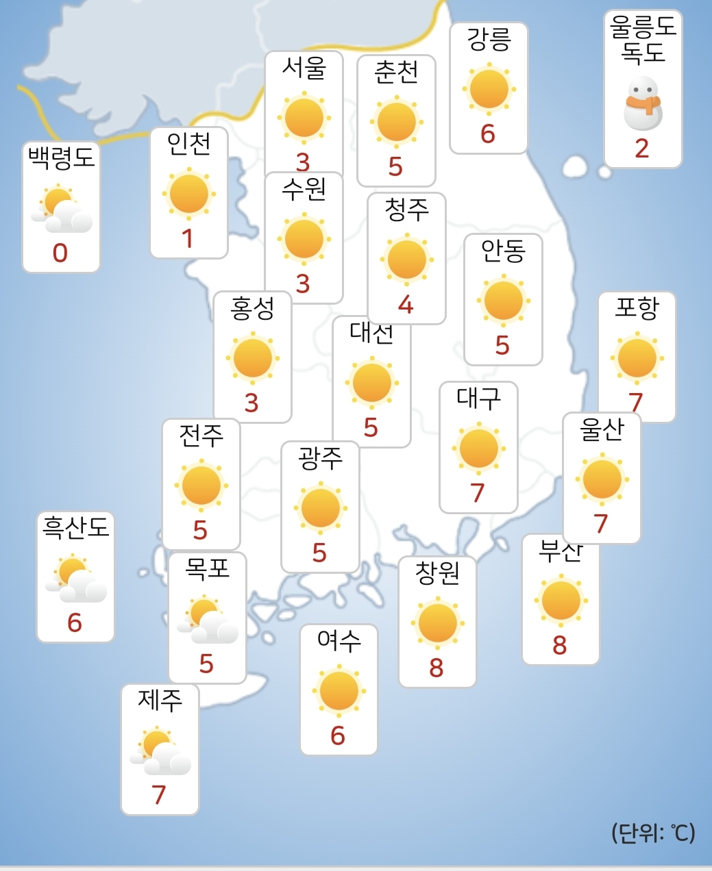 - 오늘(17일) 낮최고기온은 1~8도가 되겠습니다.
