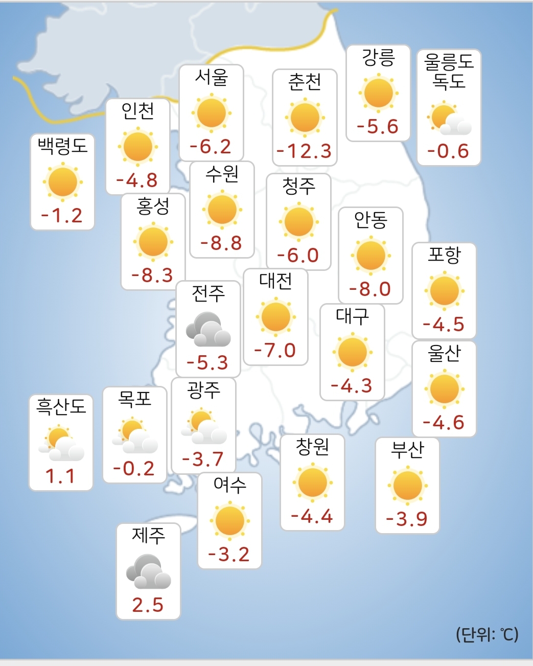 - 내일(25일) 아침최저기온은 -8~0도, 낮최고기온은 6~12도가 되겠습니다.