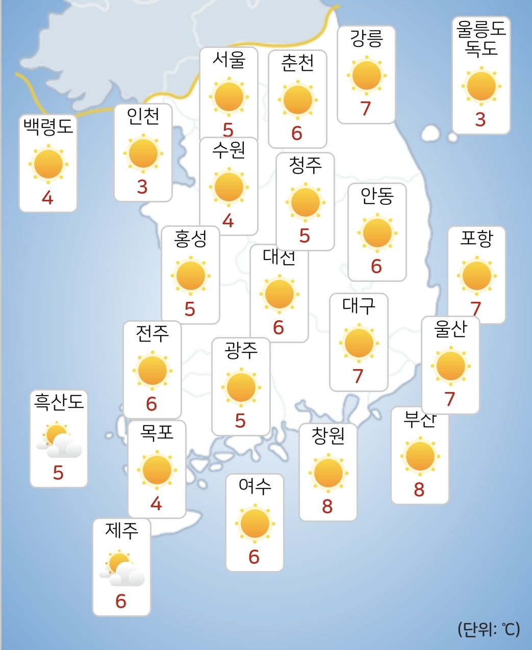 - 오늘(24일) 낮최고기온은 3~8도가 되겠습니다.
