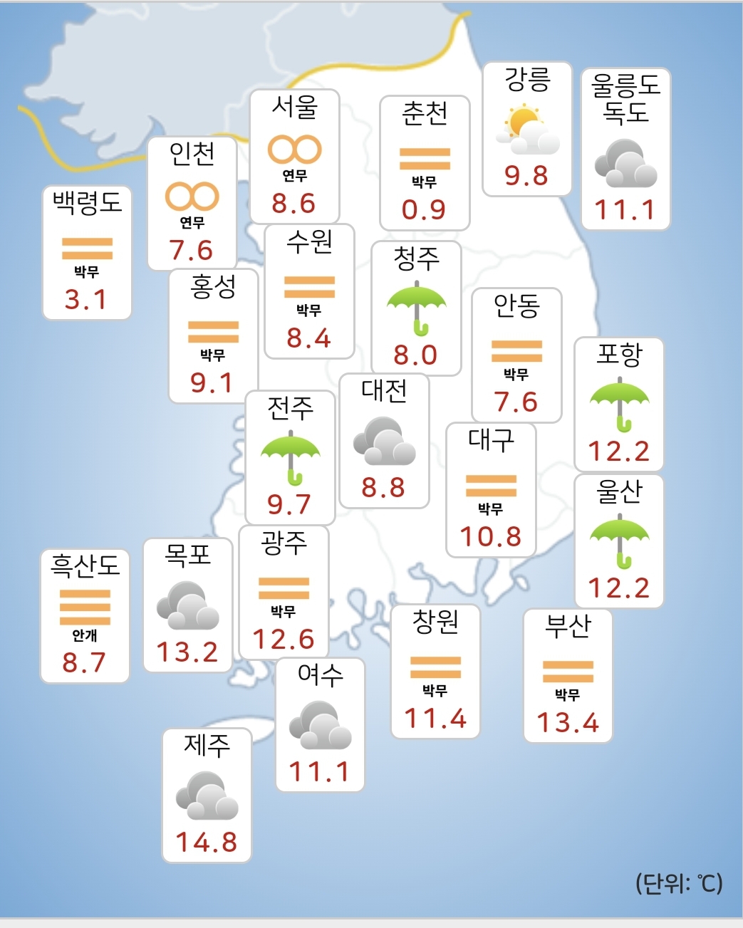 ○ (하늘상태) 모레(4일)까지 전국이 대체로 흐리겠습니다.