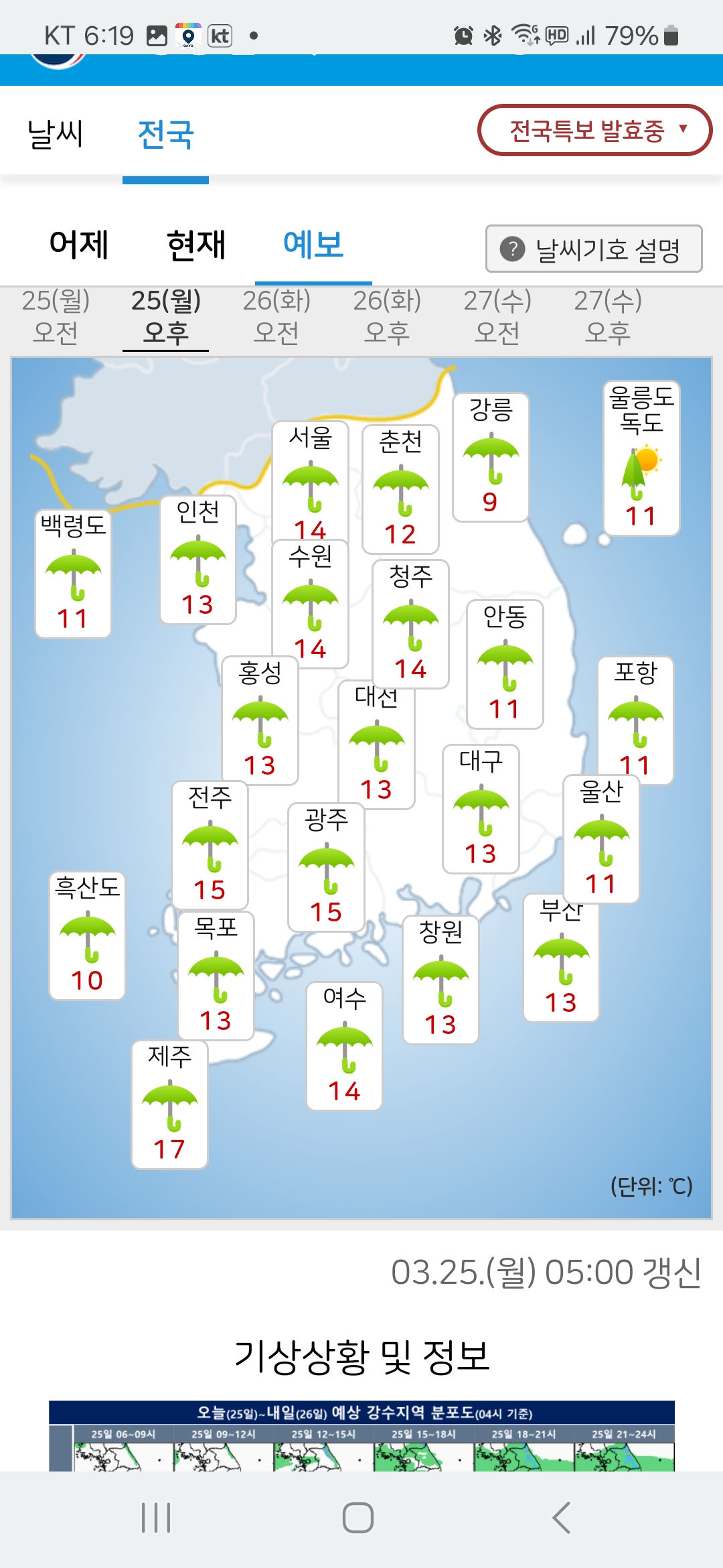 ○ (오늘) 오늘(25일)은 동해북부해상에 위치한 고기압의 영향으로 아침(06~09시)부터 강원영동에 비가 내리는 곳이 있겠습니다. 또한, 중국 상하이 부근에서 제주도 부근 해상으로 이동하는 저기압의 영향으로 제주도에는 비가 내리겠고, 오전(09~12시)부터 전남해안, 오후(12~18시)부터 그 밖의 전국으로 비(강원내륙.산지 비 또는 눈)가 확대되겠습니다. 한편, 오전(09~12시)에 중부지방(강원영동 제외)에는 산발적으로 0.1mm 미만의 빗방울이 떨어지는 곳이 있겠습니다.