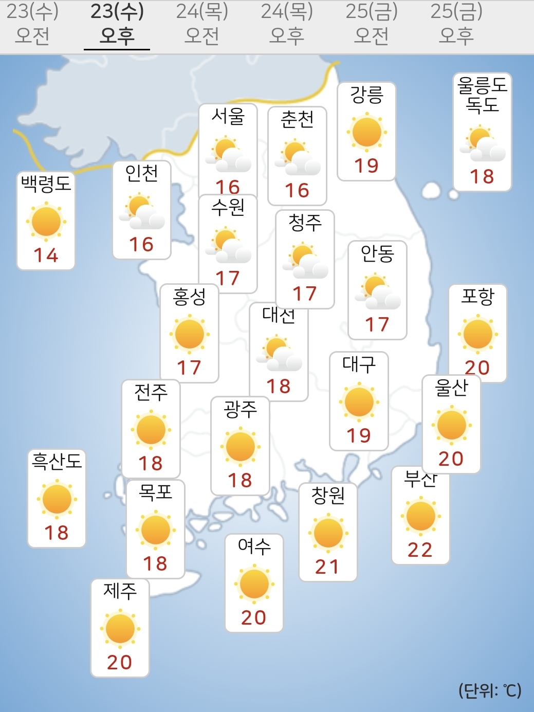 - 오늘(23일) 낮최고기온은 15~22도가 되겠습니다.