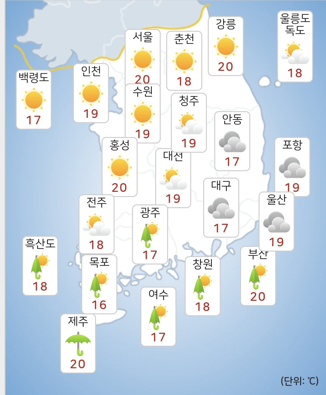 - 오늘(10일) 낮최고기온은 16~21도가 되겠습니다.