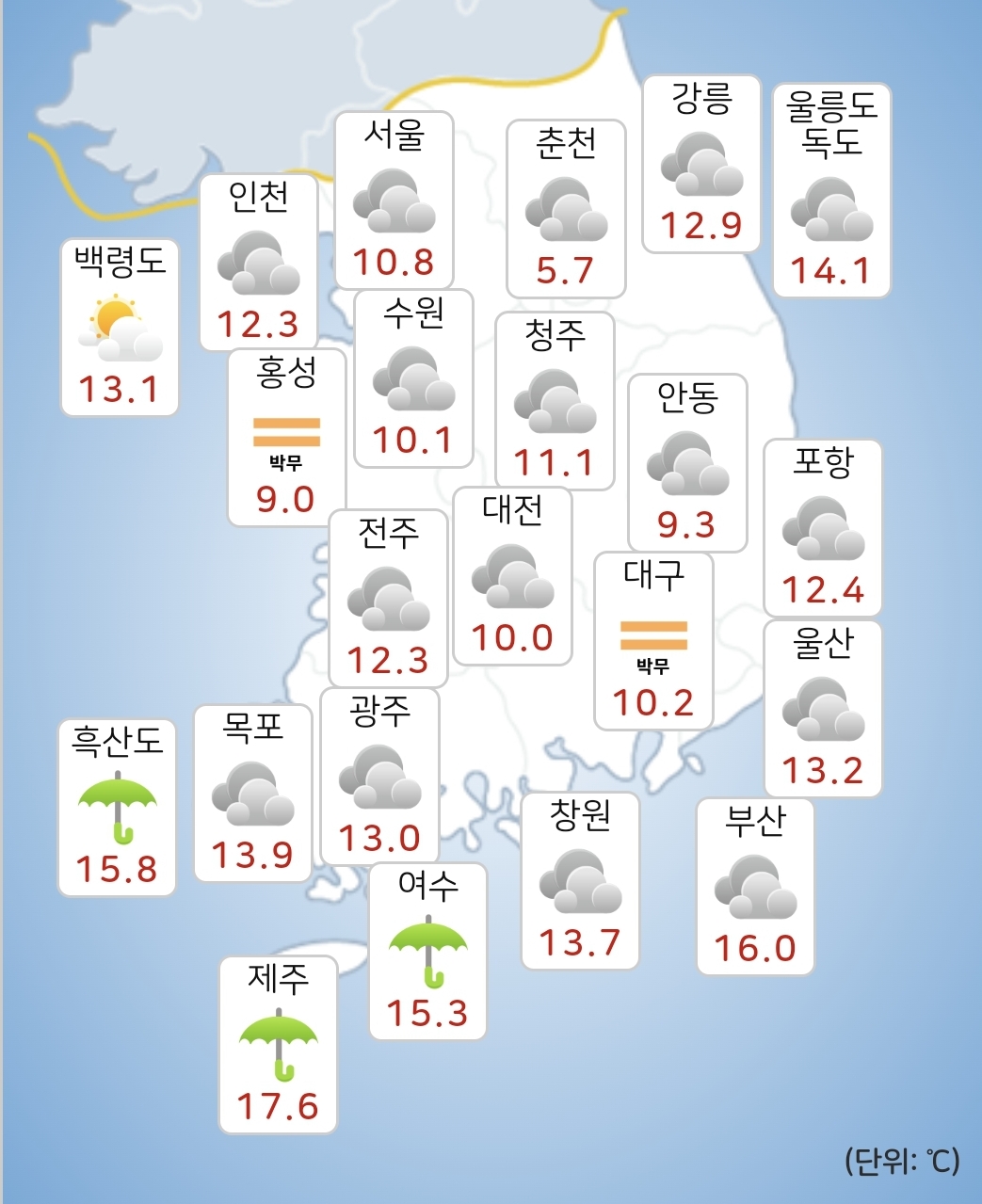 - 내일(11일) 아침최저기온은 5~13도, 낮최고기온은 17~23도가 되겠습니다.