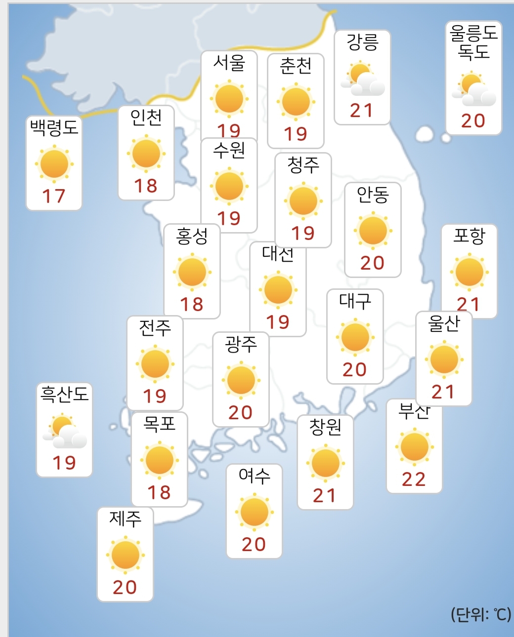 - 오늘(12일) 낮최고기온은 17~22도가 되겠습니다.