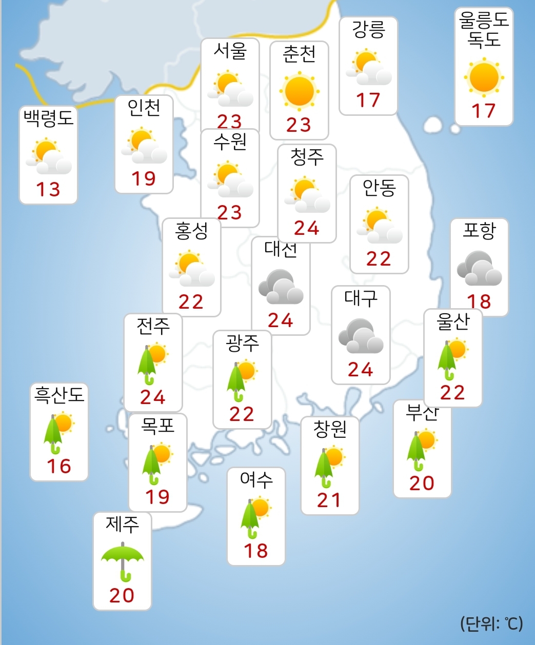 - 특히, 오늘(2일) 낮 기온이 중부지방은 15~20도 내외, 남부지방과 제주도는 20도 이상으로 올라 평년보다 5도가량 높겠고, 내일(3일) 아침 기온이 중부지방은 10도 내외, 남부지방과 제주도는 15도 내외로 평년보다 10도가량 높겠습니다.