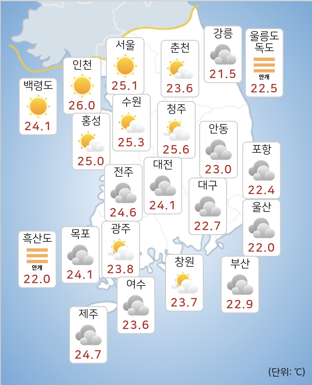 - 모레(17일) 아침최저기온은 22~25도, 낮최고기온은 26~32도가 되겠습니다.