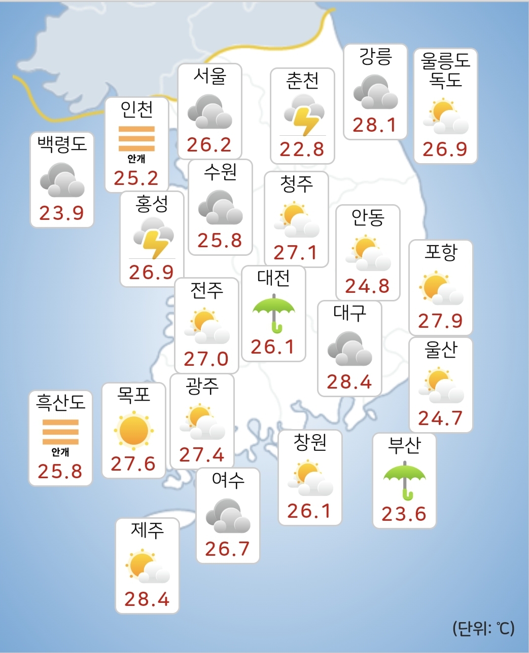- 내일(25일) 아침최저기온은 23~28도, 낮최고기온은 30~35도가 되겠습니다.
