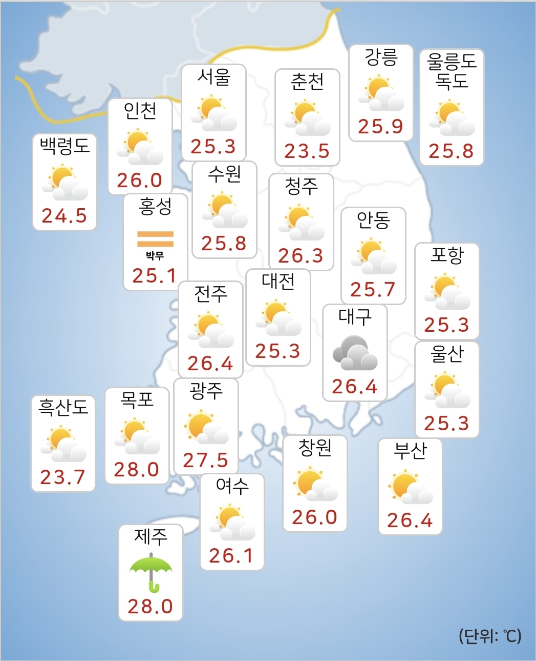 - 오늘(26일) 낮최고기온은 29~34도가 되겠습니다.