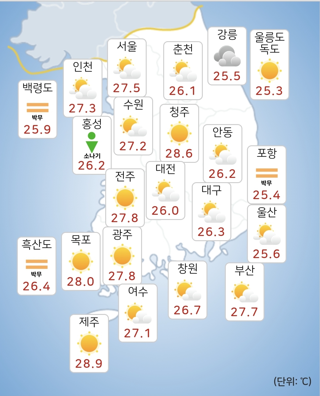 - 내일(6일) 아침최저기온은 24~27도, 낮최고기온은 30~35도가 되겠습니다.