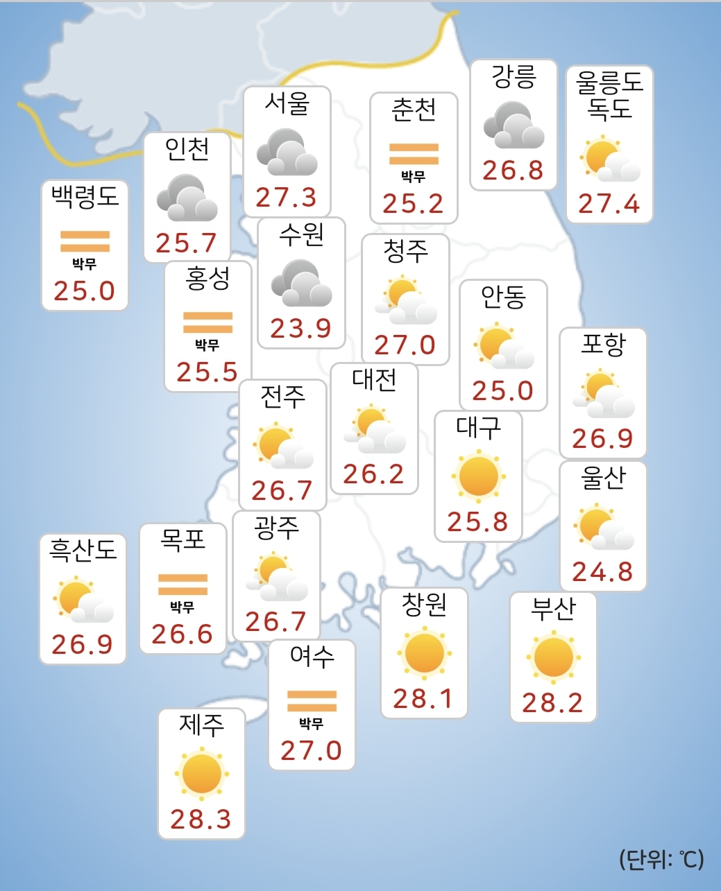- 모레(10일) 아침최저기온은 22~27도, 낮최고기온은 29~35도가 되겠습니다.