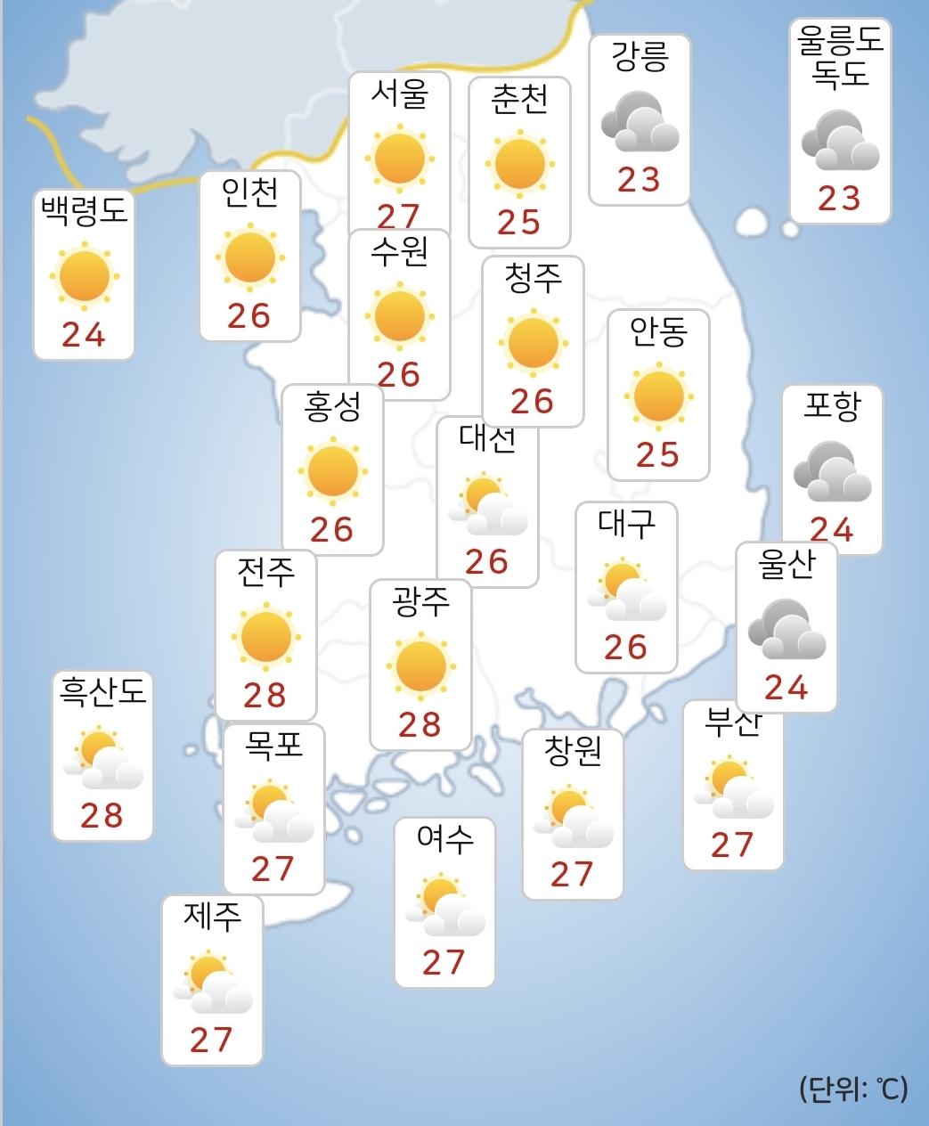 - 오늘(23일) 낮최고기온은 22~28도가 되겠습니다.