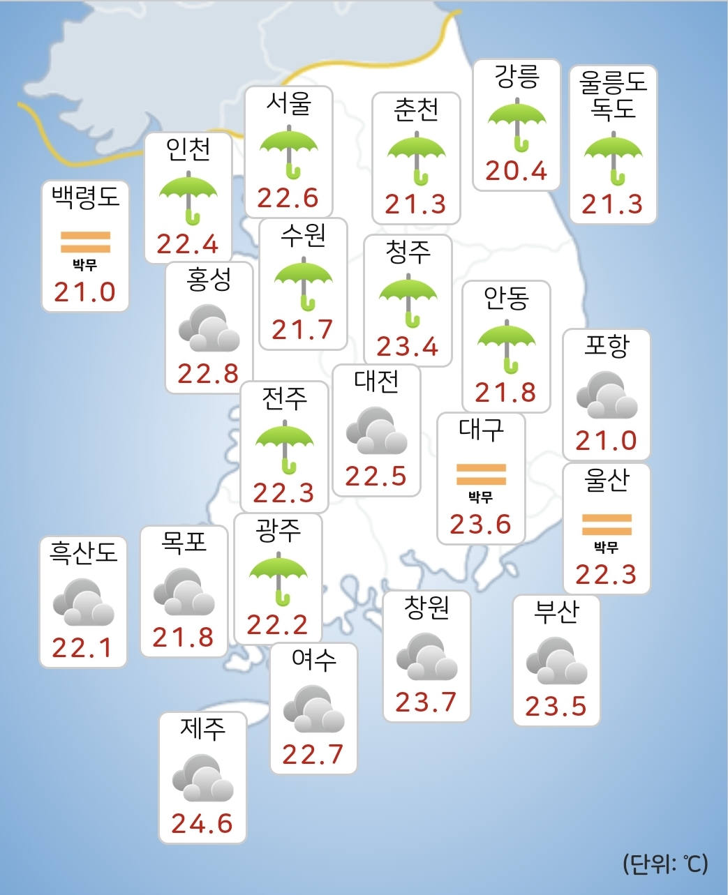 - 내일(24일) 아침최저기온은 20~23도, 낮최고기온은 24~31도가 되겠습니다.