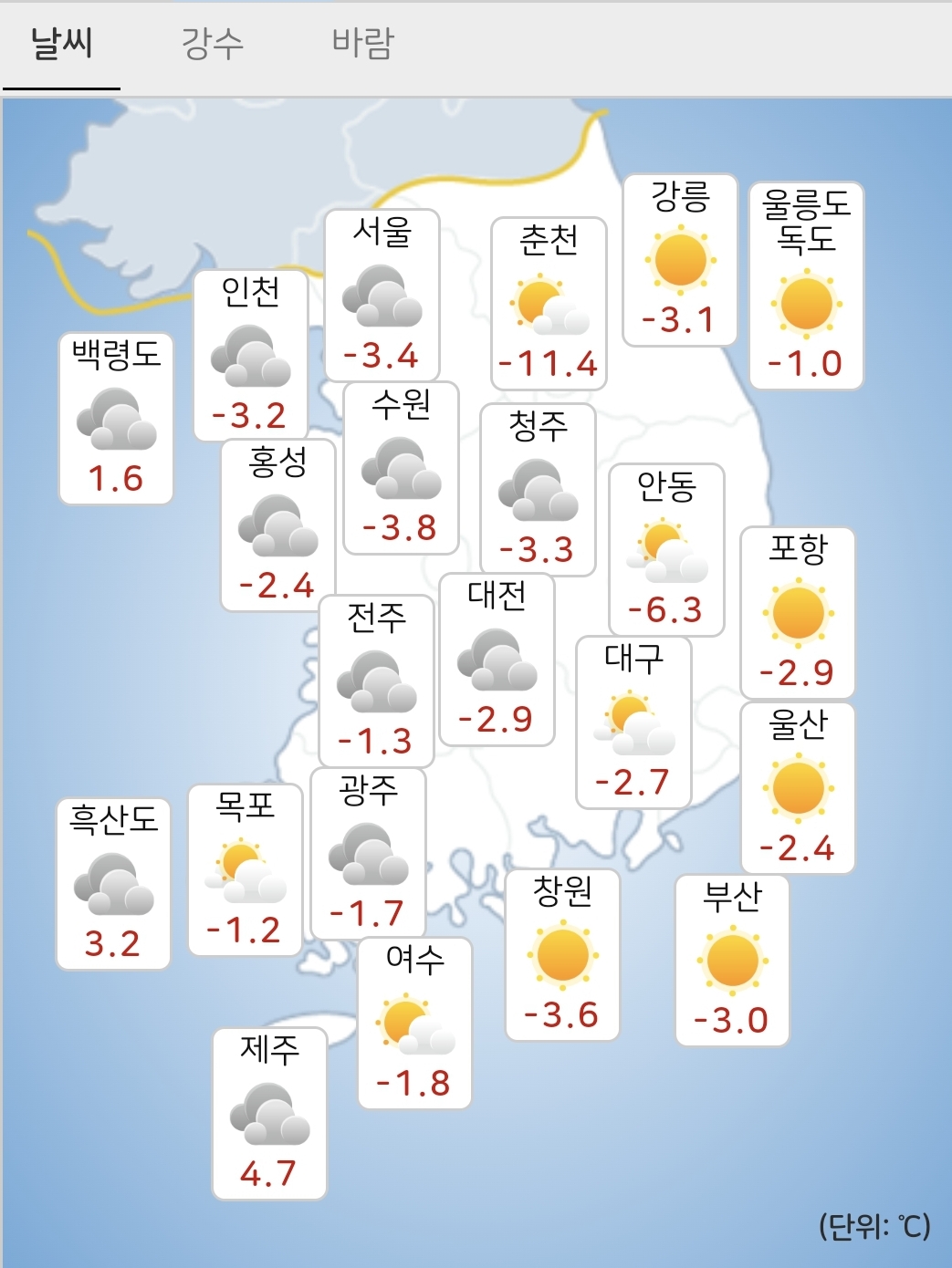 - 내일(17일) 아침최저기온은 -12~0도, 낮최고기온은 3~9도가 되겠습니다.