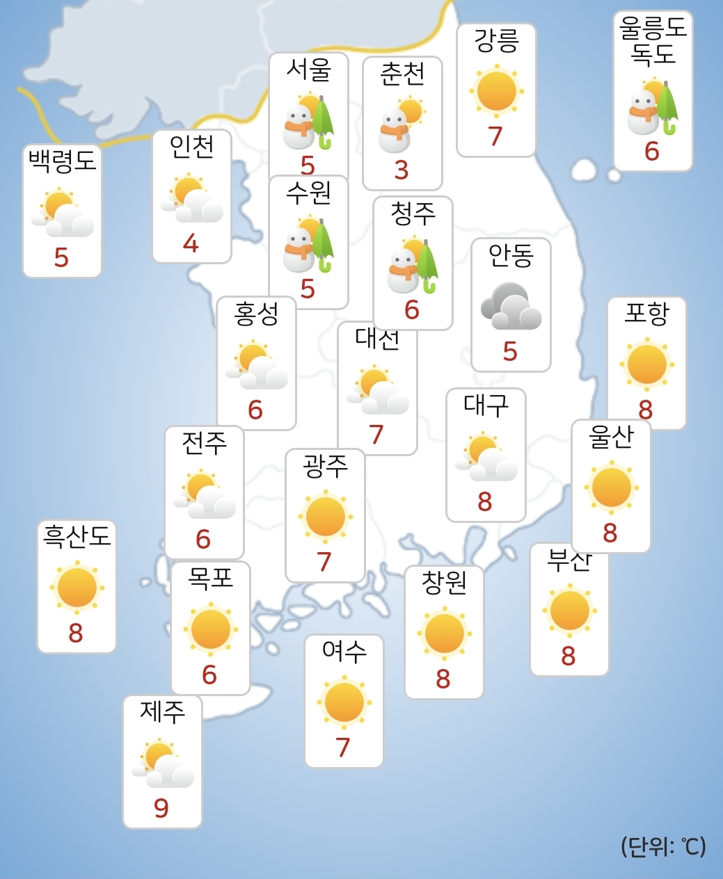 - 오늘(16일) 낮최고기온은 3~8도가 되겠습니다.