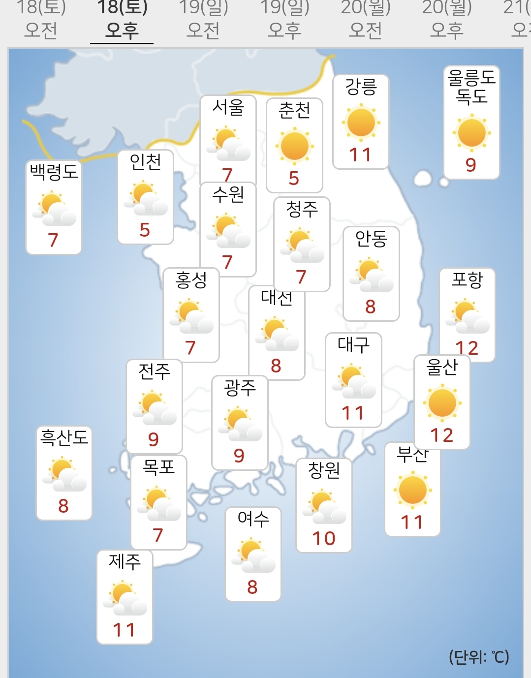 - 오늘(18일) 낮최고기온은 5~12도가 되겠습니다.
