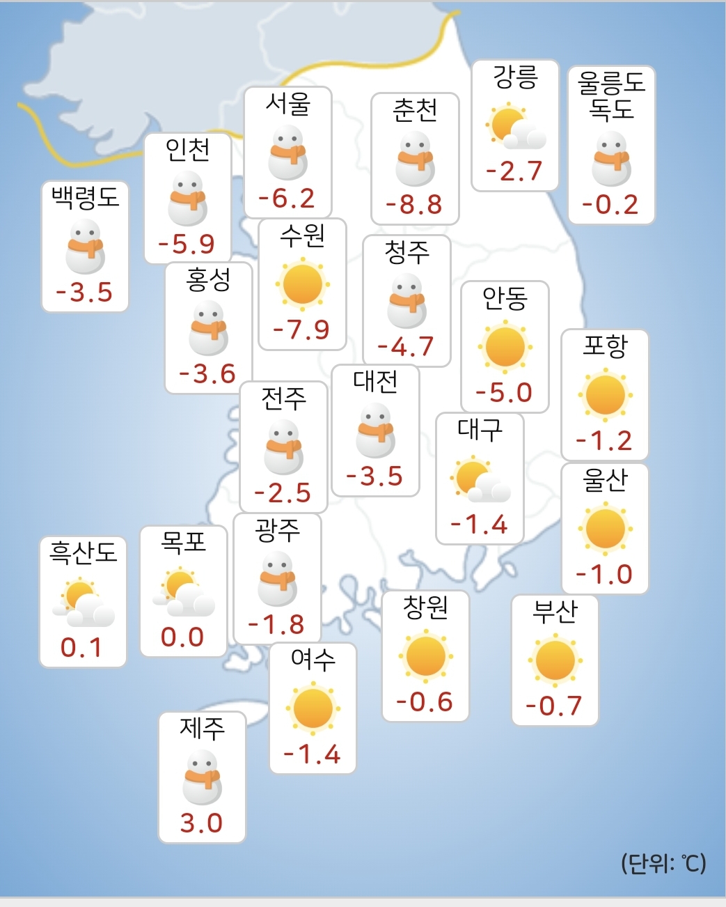 - 내일(30일) 아침최저기온은 -17~-1도, 낮최고기온은 -4~8도가 되겠습니다.