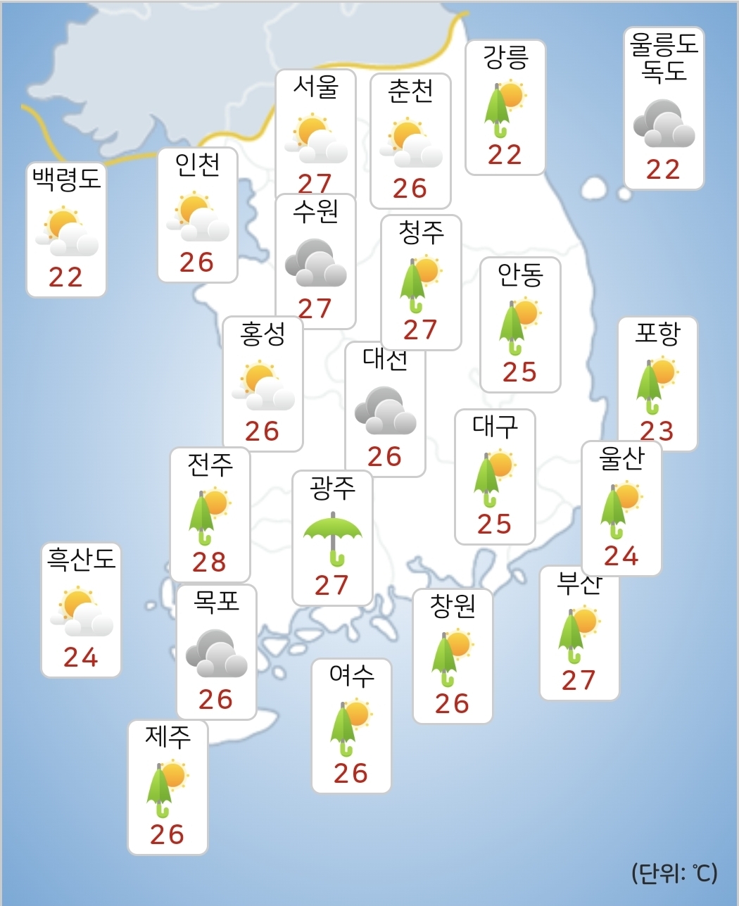 - 오늘(8일) 낮최고기온은 22~28℃가 되겠습니다.
