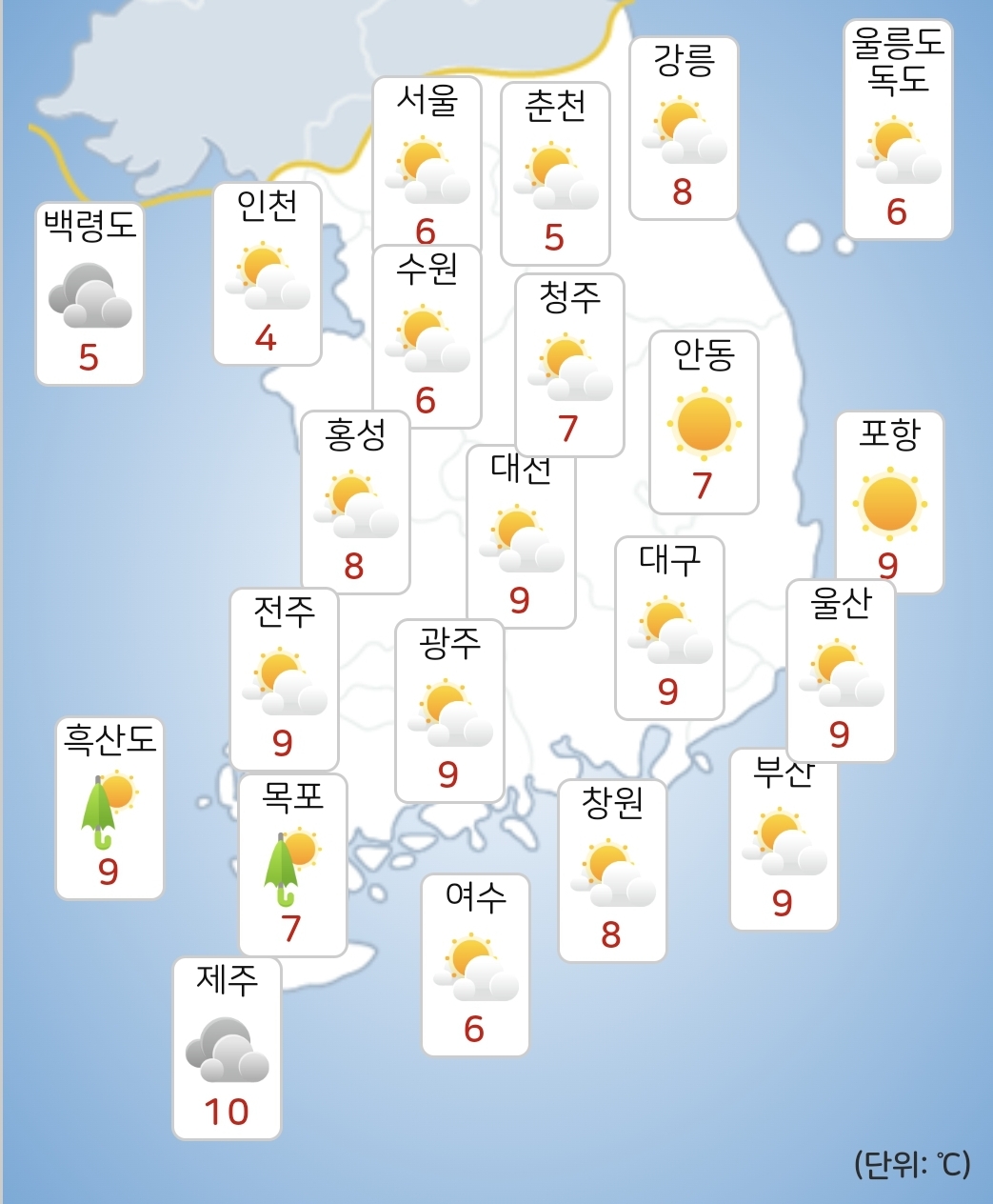 - 오늘(11일) 낮최고기온은 4~9도가 되겠습니다.