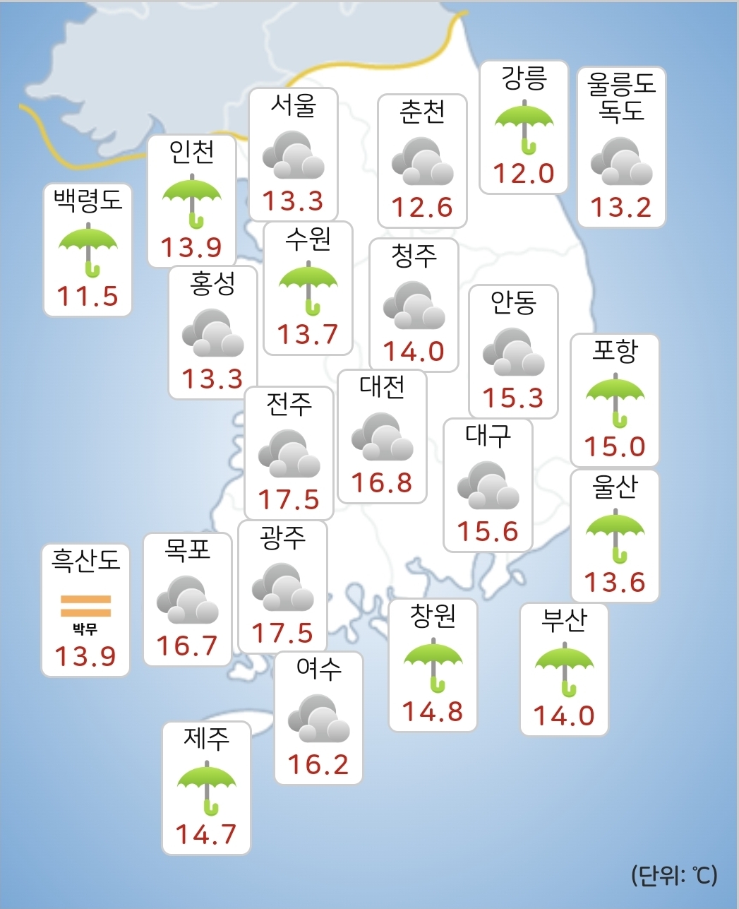 - 내일(25일) 아침최저기온은 8~14도, 낮최고기온은 18~26도가 되겠습니다.
