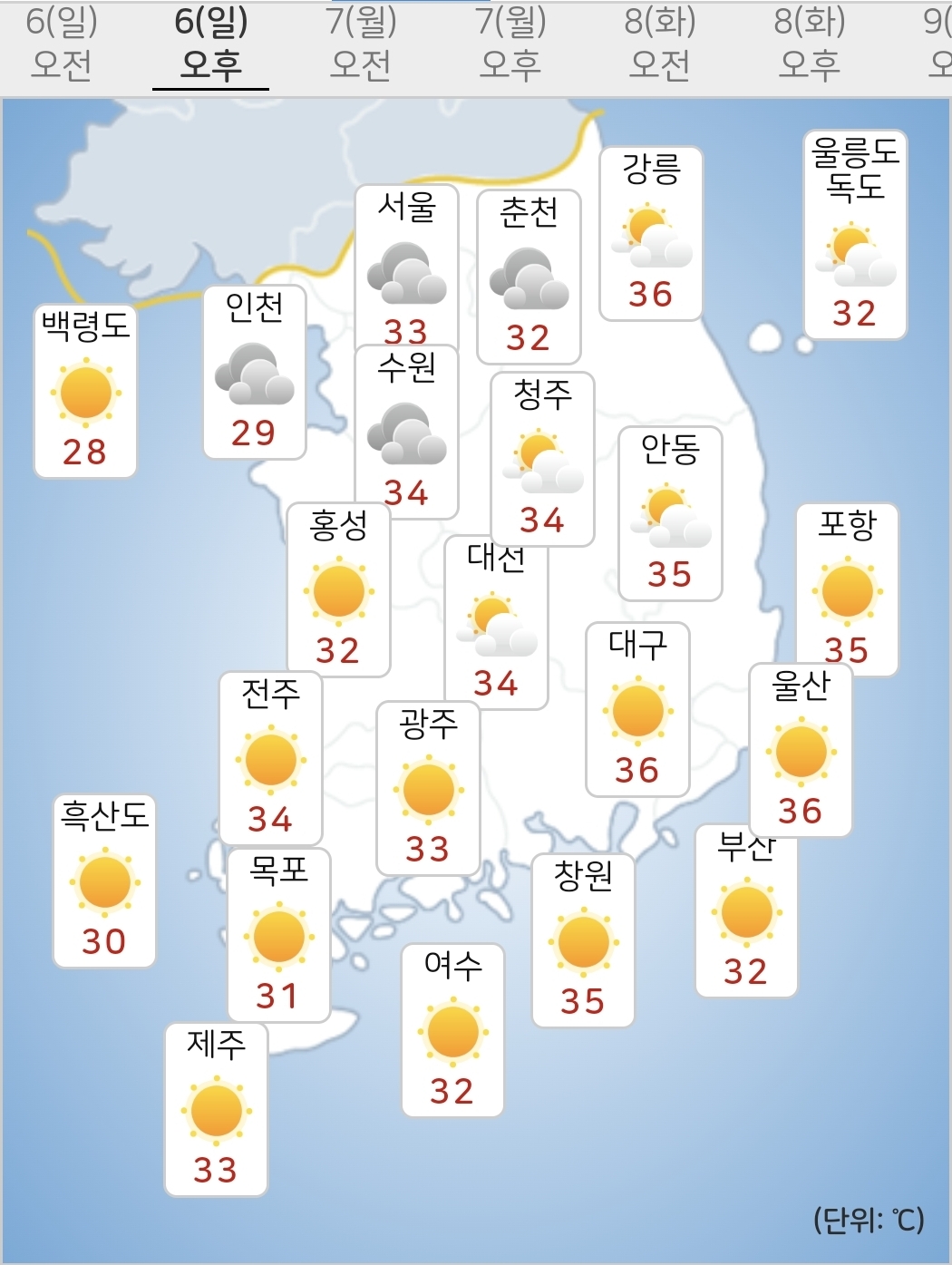 - 오늘(6일) 낮최고기온은 29~36도가 되겠습니다.