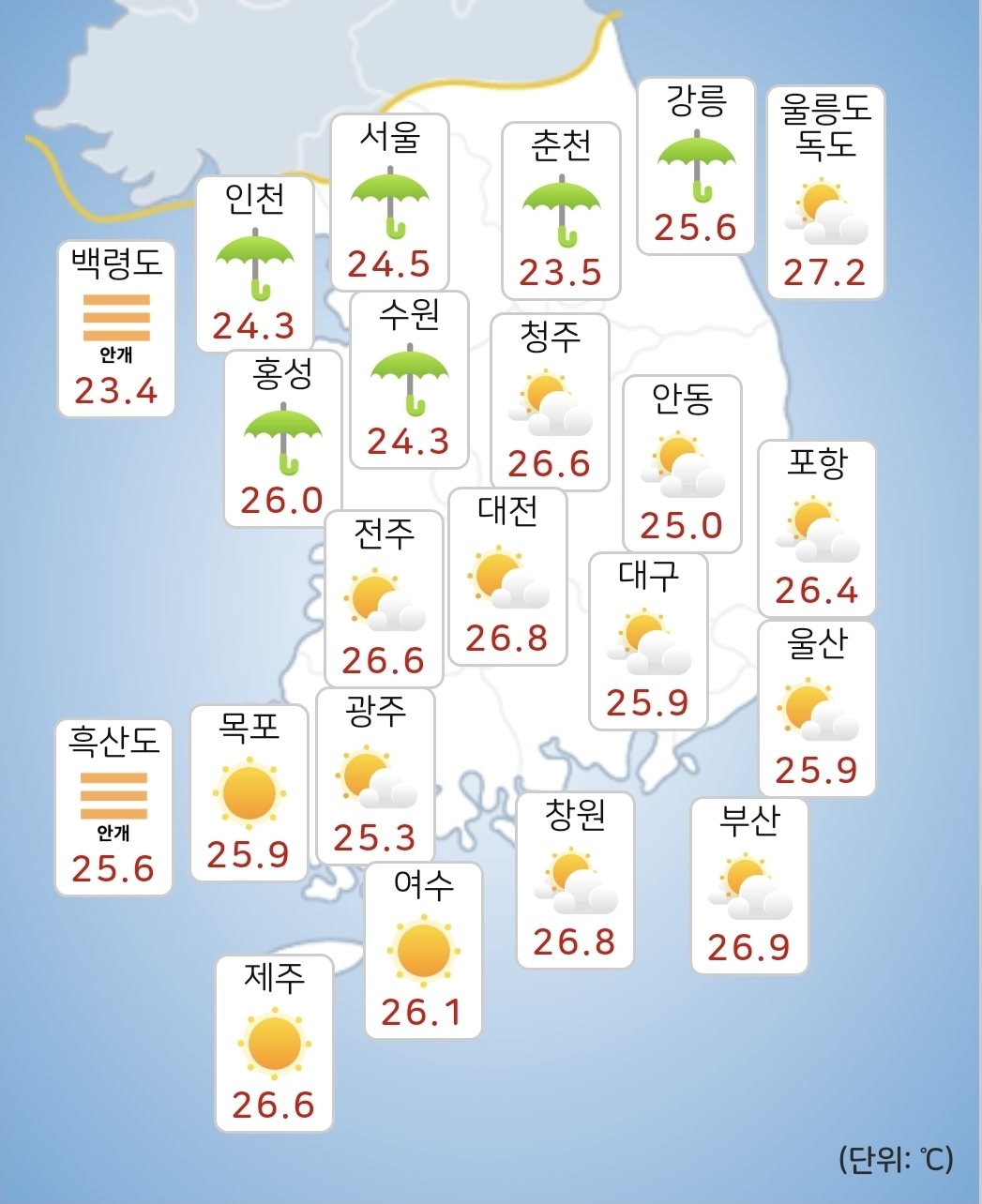- 내일(15일) 아침최저기온은 22~26℃, 낮최고기온은 30~34℃가 되겠습니다.