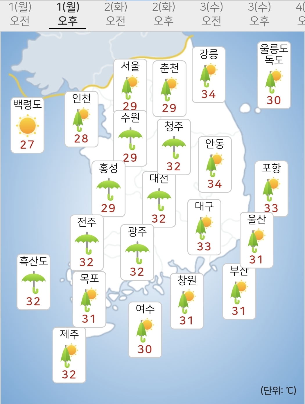 - 오늘(1일) 낮최고기온은 27~34℃가 되겠습니다.