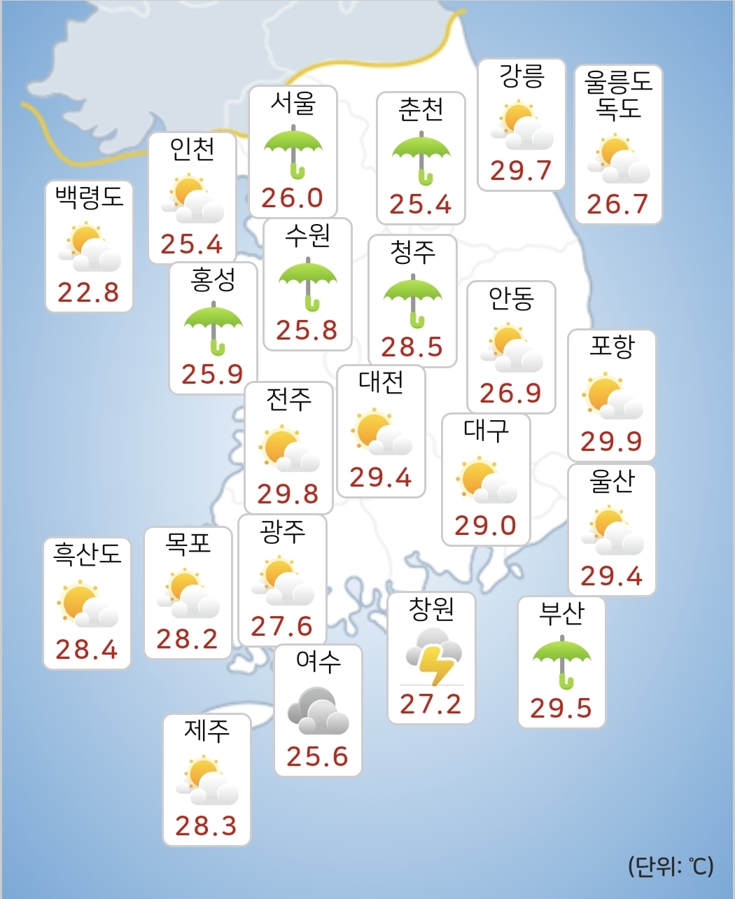 - 내일(2일) 아침최저기온은 20~26℃, 낮최고기온은 28~32℃가 되겠습니다.