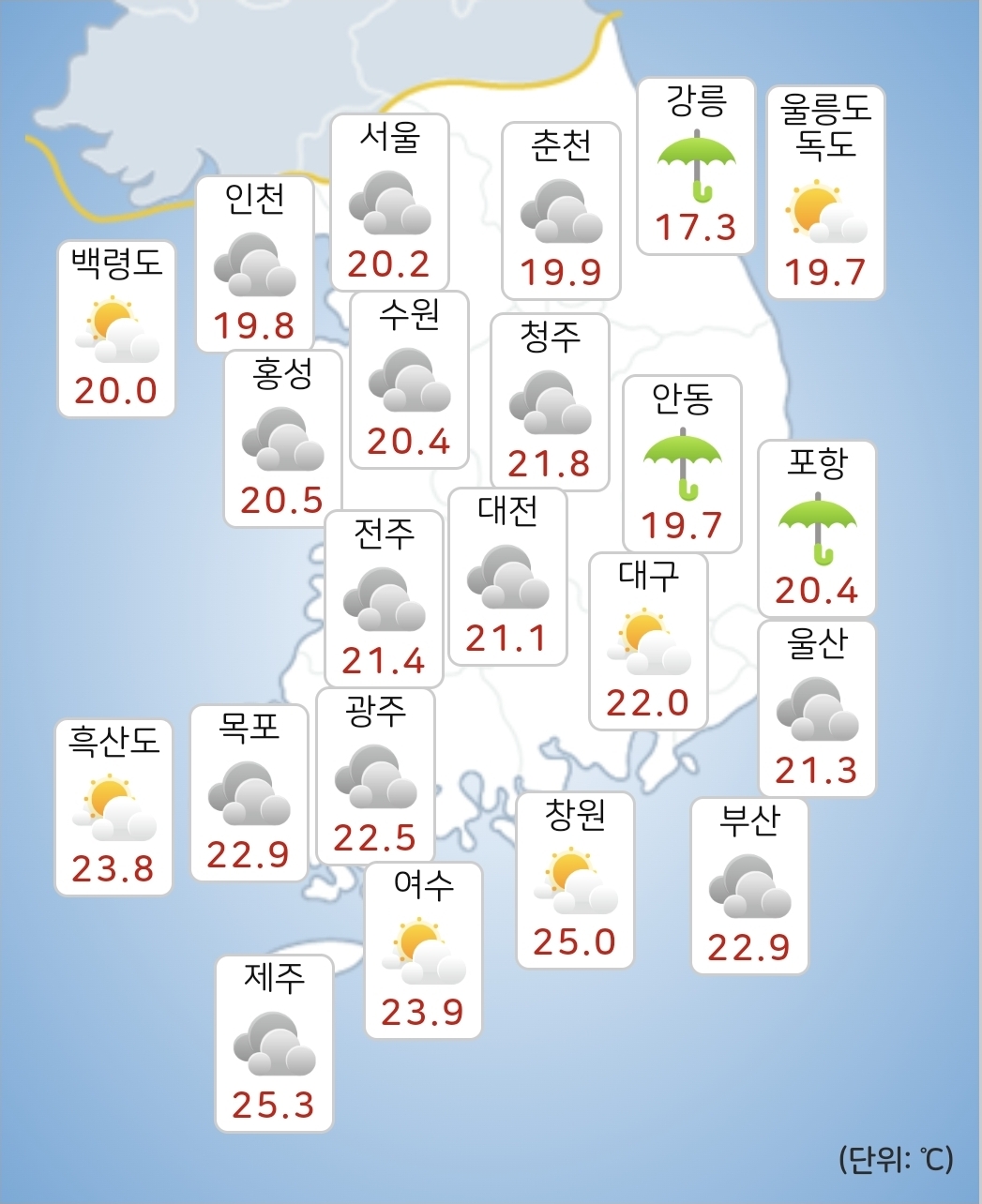 - 모레(20일) 아침최저기온은 15~23℃, 낮최고기온은 22~29℃가 되겠습니다.