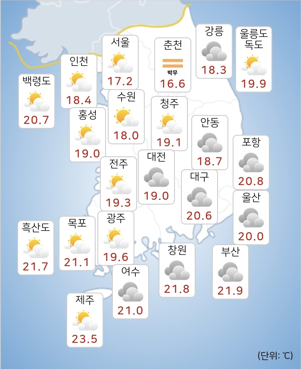 - 내일(30일) 아침최저기온은 14~19℃, 낮최고기온은 23~27℃가 되겠습니다.